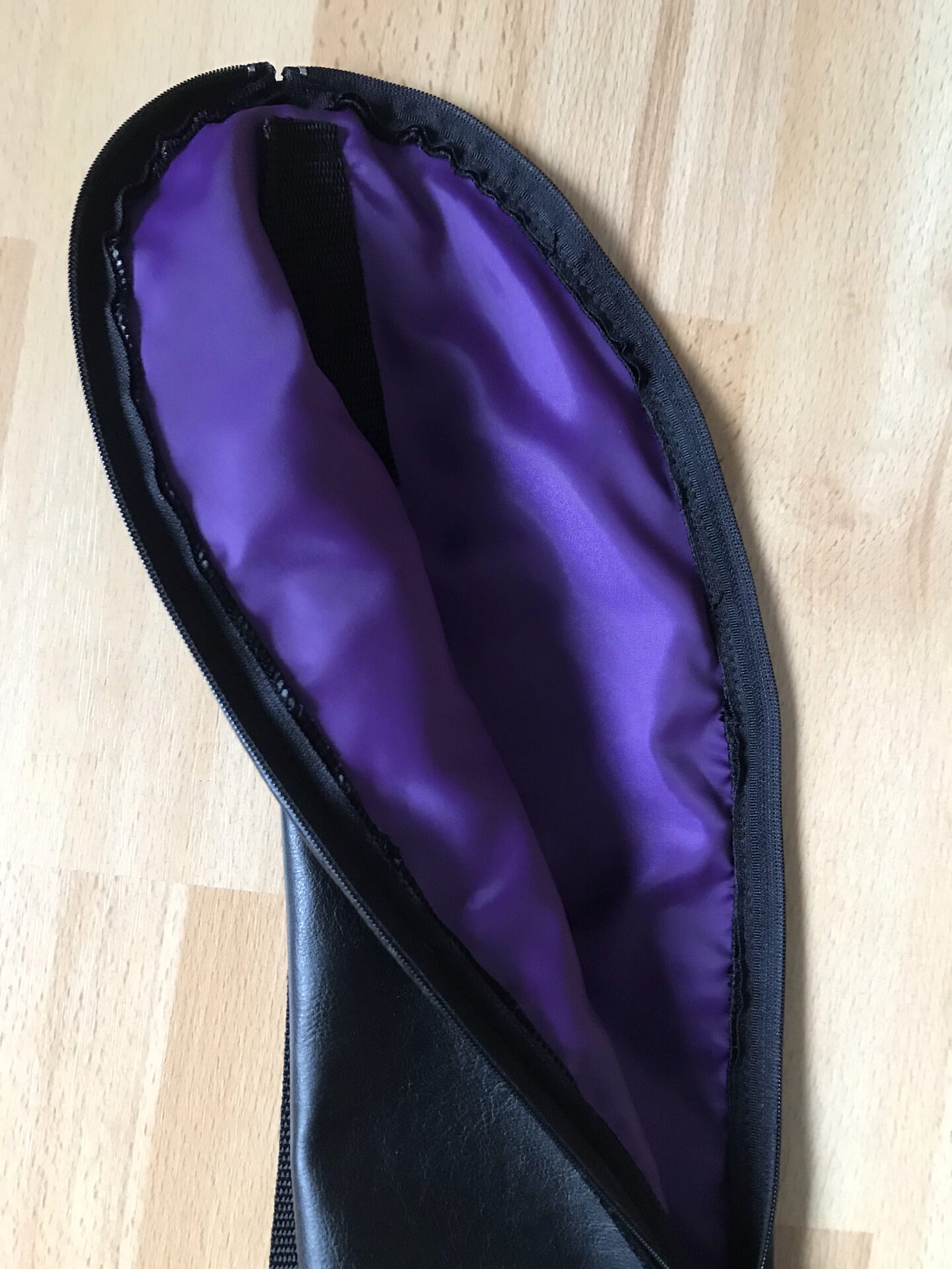 A simple zip up bag with a strap to keep your canes and crops neat and discrete when storing or transporting them. This bag is made by Bondatrix in the UK and can be made to measure to fit any cane or crop. Simply measure around the widest part of your piece of kit and the total length, and the bag can be made to fit. Otherwise a standard size will be sent which fits most standard crops and canes. A standard bag is approximately 90cm long and 12cm wide. It has an adjustable shoulder strap, and a small clip you can use to hang it up or clip it onto another bag, such as our full size kit bags. Choose your outer fabric and lining from the menu. The most popular is black leatherette outer fabric, and either the red or purple lining fabric.
