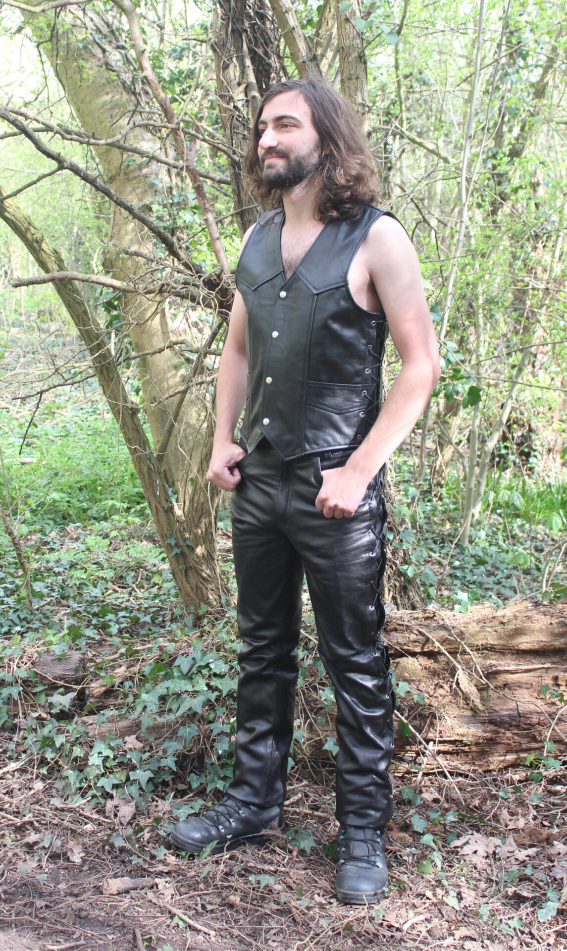 A classic fetish outfit, real leather trousers with a real leather matching waistcoat. This outfit features side lacing detail on the trousers and the waistcoat, which adds interest and allows for a slight amount of adjustability to help get an even better fit.