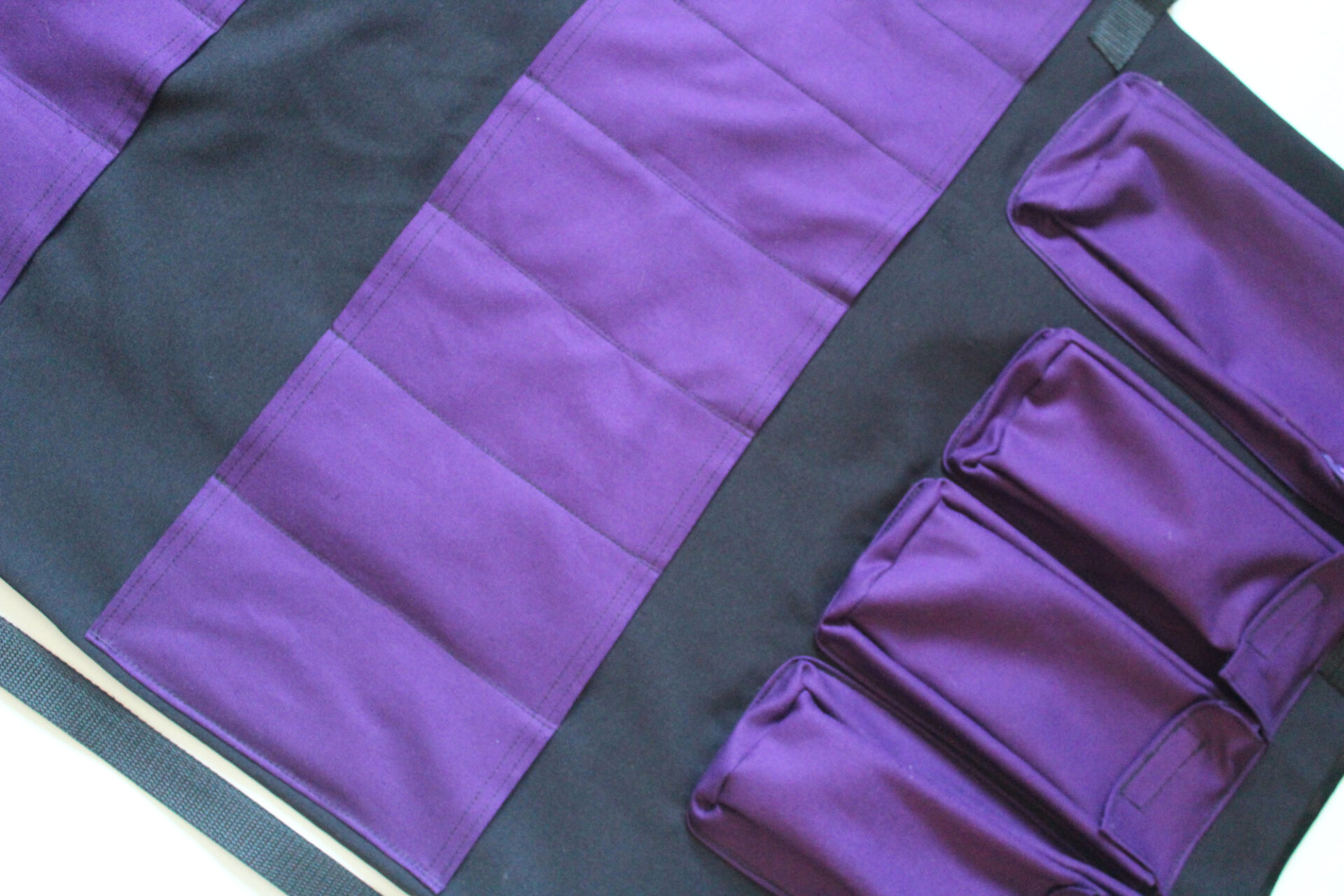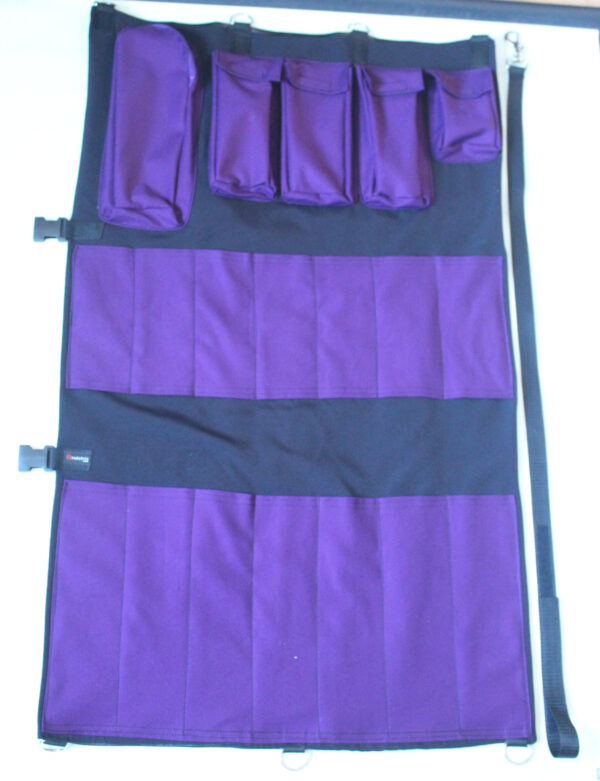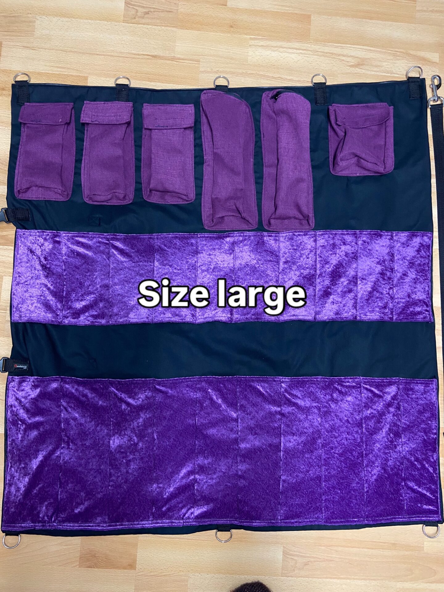 You can determine the number and size of pockets and equipment slots by ordering different size bags from the drop down menu. You can choose the fabric and colour. Bag shown is black PVC with purple cotton pockets.