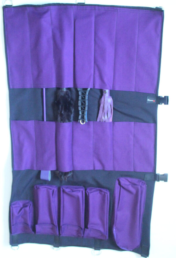 A great way to store or transport your fetish equipment. This bag has only wide slots (great for floggers and collars etc) and more pockets than our standard kit bag and includes a zip-up pocket as well as velcro-shut pockets. This makes it more suitable if you have fewer narrow items such as canes but more smaller items such as clamps, vibes/wands and sensation toys and mostly floggers for impact play. The medium bag will have 7 slots suitable for floggers/cuffs or a couple of canes/crops per slot. It will have 1 small pocket, 3 medium pockets and 1 large zip-up pocket.