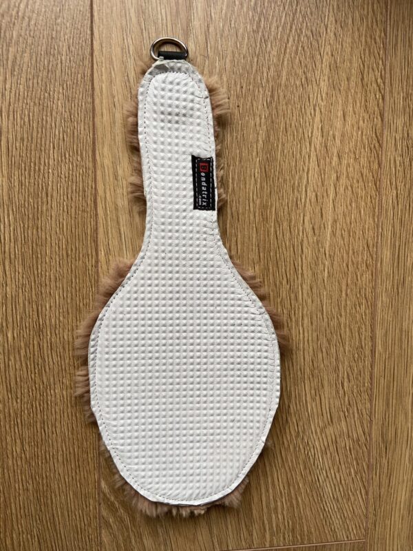 A compact but effective paddle. Great for sensation play. A soft thuddy and stroking real fur side, and then a white slightly more intense side with an interesting dimple texture on the leather for stroking. This is a great paddle for beginners and experienced BDSM players.