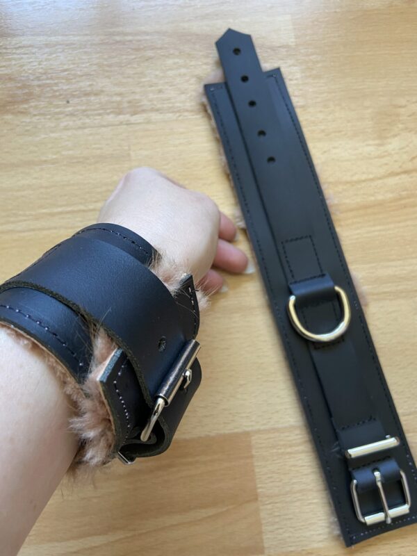 Strong bondage cuffs made with real leather and welded D-rings great for heavy bondage. Feature a soft real brown fur lining to make them comfortable to wear. Made to order in the UK. One size fits most and they are adjustable but if you supply wrist measurements they will be made to the optimal fit for your wrist for no extra charge.