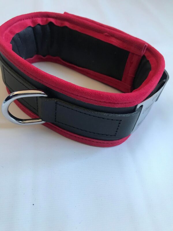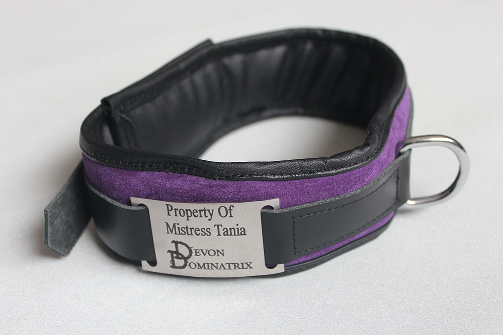 A great collar for bondage and scening. It is made from black leather, padded, with suede edging and a welded D-ring. The padding makes it particularly comfortable to wear for long periods of time. The buckle width is 1 inch and the collar is 2 inches wide. The engraved plate is made from stainless steel and has an engraved area 4.4cm wide and 3.5cm high.