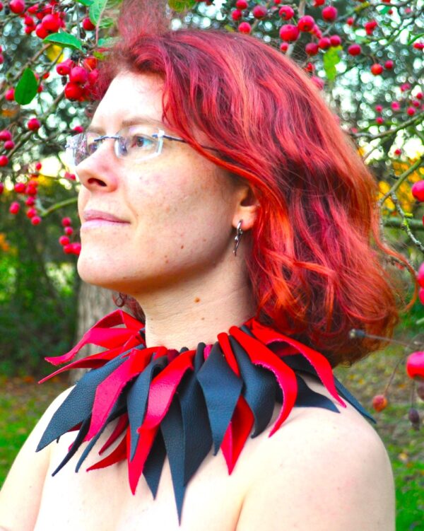 An amazing collar which looks fabulous with any low cut top or dress, or a corset. It fastens with a buckle at the back, making it secure and easy to wear and offering adjustability in the sizing.