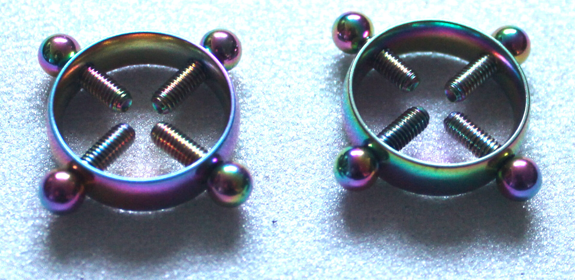 A gorgeous pair of circle nipple clamps with an amazing multicoloured finish. They are very adjustable, screwing closed in four ways, so you can achieve a comfortable fit for long term wear as a piece of jewellery, or a tighter pinch for a more painful/interesting clamp feel. The internal dimension of the clamp is 1.8cm. The price is for one pair of clamps.